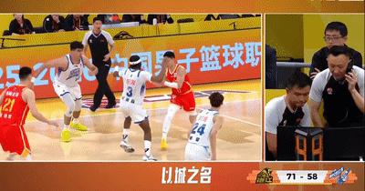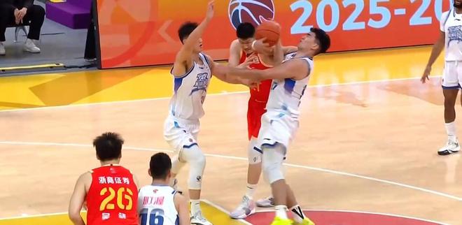 在本场比赛贡献了16分3板的胡金秋于末节持球进攻的时候突然被包夹。