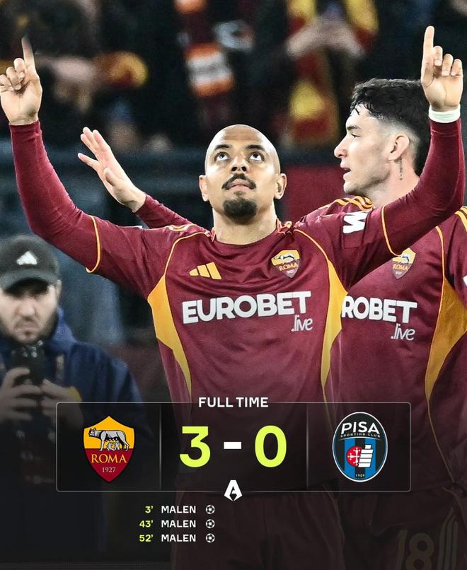 此役最大亮点属于冬窗新援马伦。这位锋线杀手单场上演帽子戏法,自1月登陆意甲以来,联赛已轰入10球,同期五大联赛仅次于凯恩的11球。短短几个月,马伦已经升至意甲射手榜第三,仅落后劳塔罗和杜维卡斯,成为罗马本赛季后半程最大惊喜。