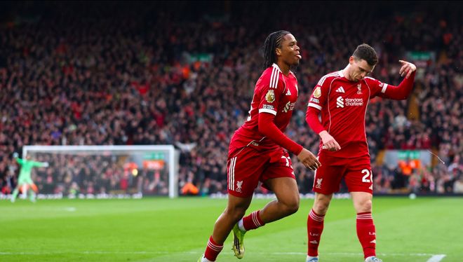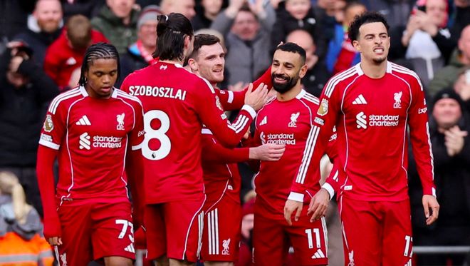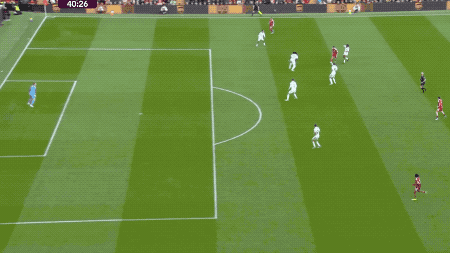 第40分钟,利物浦推动快速反击,恩古莫哈摆脱后传球,加克波架炮,萨拉赫上演标志性兜射破门。