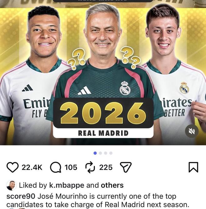 北京时间4月22日,姆巴佩在社交平台上点赞了Score90发布的一篇,关于“何塞-穆里尼奥可能回归皇家马德里”的帖子。目前他已取消点赞。