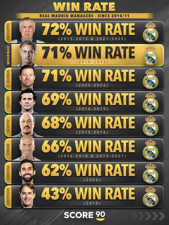 在他此前执教皇马期间,他的胜率在俱乐部历史主帅中位列第二。