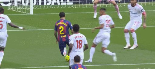 第9分钟,坎塞洛造点,拉菲尼亚打进勺子点球,巴萨1-0塞维利亚